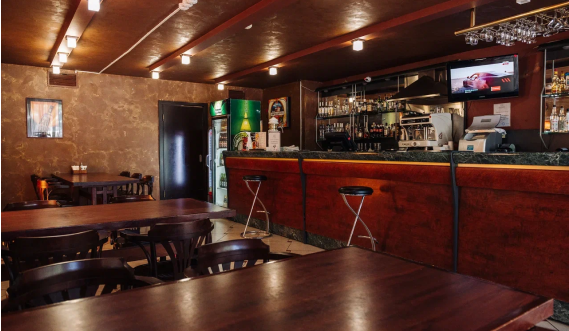 В баре-кафе «АМАКС» интерьер выдержан в благородных темных тонах с акцентами на дерево и кожу